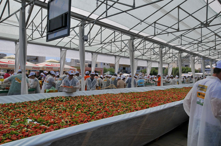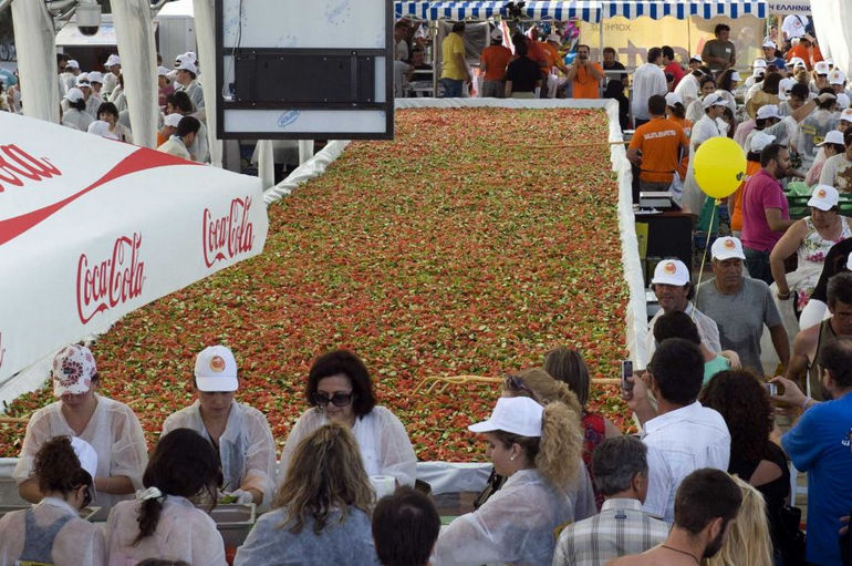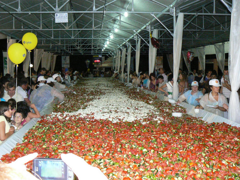 Речь идет о традиционном греческом салате. На его изготовление было потрачено 6,5 тонн помидор, 3 тонны огурцов, 800 килограммов сыра и 500 килограммов оливкового масла. Была изготовлена и специальная деревянная салатница, диаметр которой составил 25 метров. К слову, прошлое достижение было установлено в Израиле, где местные кулинары приготовили салат, который весил чуть больше 10 тонн. Жители Крита, видимо, решили перебить достижение с таким расчетом, чтобы в ближайшее время никто не мог угрожать их рекорду.