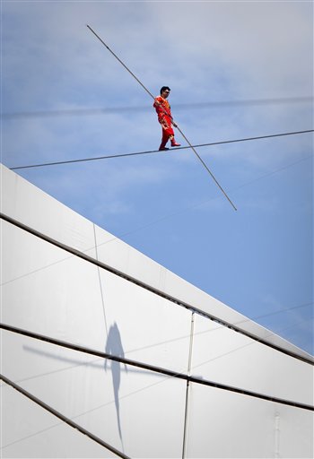 Только представьте, ширина троса составляла всего три сантиметра и это при том, что он был, натянут на высоте шести десятков метров над землей. Было подсчитано, что мужчина ежедневно проходил по тросу порядка 20 километров, находясь при этом практически под самым куполом спортивного сооружения, высота которого составляет 69 метров в максимальной точке.